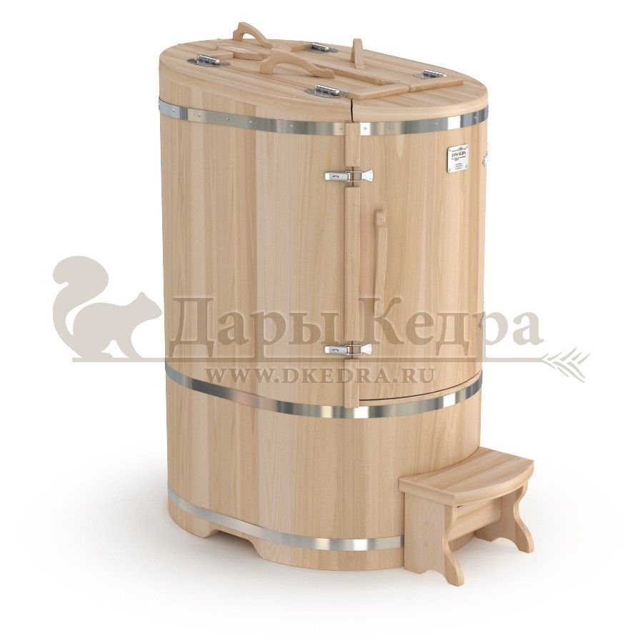 Овальная фитобочка из кедра - это мини парная, которую можно использовать не только в спа-салонах, но и дома. Овальная модель более просторна и удобна в использовании. Толщина стенок составляет 40-45 мм, что позволяет увеличить срок службы изделия. Верхний скос делает положение головы более комфортным и улучшает обзор. Она оборудована откидными створками, дверцей и отверстием для головы. Во время парения человек сидит внутри кедровой бочки, а голова находится снаружи. Благодаря этому исключается возможность перегрева. Подлокотники из кедра, встроенные ручки на створках и двери делают эксплуатацию более удобной.