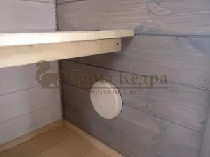 - Внутренняя обшивка: стены – евровагонка штиль, пол – доска шпунт или ламинат (на выбор). Обработка древесины защитным средством. Цвет – стены - белый лиссирующий, торцы и пол – серый лиссирующий.