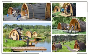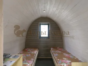 Такой кемпинг дом удобное и практичное решение для дачного использования или обустройства загородных баз отдыха. Изготовлен из хвойных пород древесины. Кровля из мягкой черепицы и цельный навес по всему фасаду изделия обеспечивают защиту от осадков. Домик включает в себя две спальные комнаты с четырьмя кроватями. По вашему желанию одно из помещений можно оборудовать под душевую зону с санузлом. Для удобства пользования в домике находится навесной столик, полка и вешалка. Входная дверь изготовлена из двойного стеклопакета.